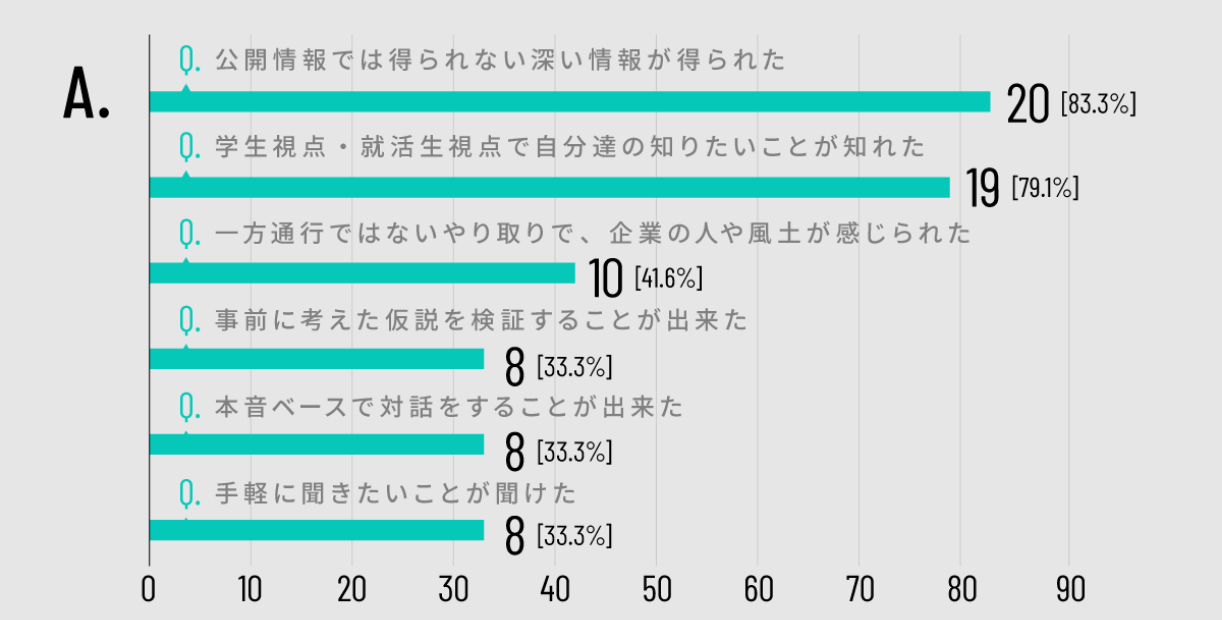 直接学生さんから質問をいただくことで、自分自身でも改めて自社への理解を深めるきっかけにもなりました。特に、学生さんが企業選びの際に魅力に感じるポイントは、会社としてはあまりにも当たり前に感じていたり到底アピールにはならないと認識していた点も多く含まれており、実際に今後の会社説明の内容に取り入れたくなる活用度の高い情報をたくさんいただきました。