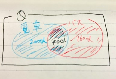 ベン図を書けば1発。バスのみ使用が1200人、電車使用者が1600人ですね。