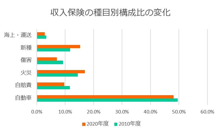 コロナ禍においてもメインとなる自動車保険があまり影響を受けなかった為、2021年度の保険料収入は前年度に比べ1.3%(1,136 億円)増加して8兆8,063億円の増加という結果になっています。ただ、2010年度~2020年度までの10年間の保険収入の推移を見てみると新車販売の減少での自動車保険の頭打ちや自賠責保険の販売は減少傾向にあります。