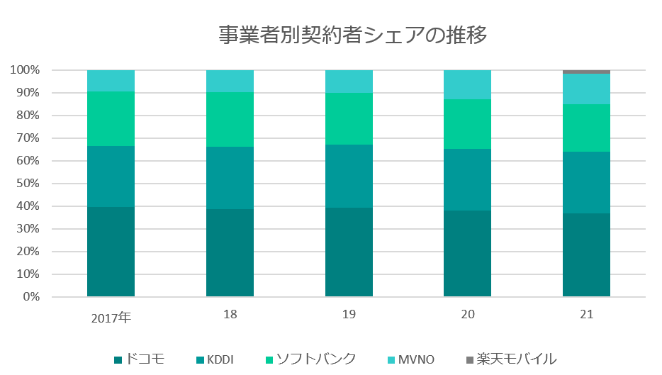 通信の料金値下げを行いましたが2021年度の業界の売上高は12兆円を超えています。これは低価格料金を展開したことにより契約数が増加、その上で通信料の値下げ部分を法人営業やクレジットカード等の金融ビジネス、モバイルに特化した動画コンテンツのサービス、ネットショッピングサイト等、顧客情報を活用した新規事業への参入で補っています。