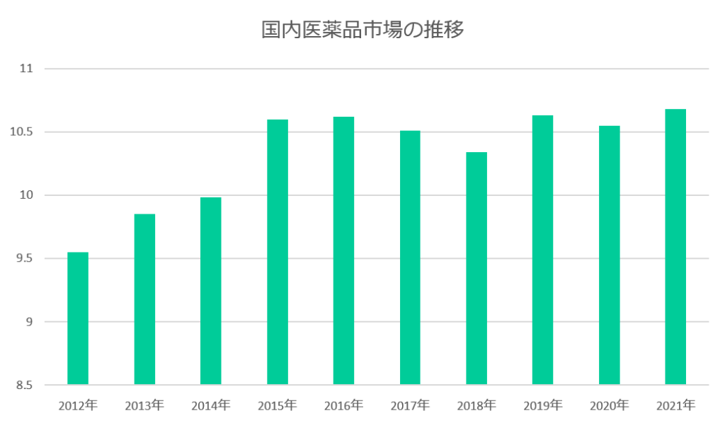 医薬品業界の2021年度の市場規模は、10兆を超え前年比2.2%の増加になっています。世界的にみても170兆円となり大きな市場になります。