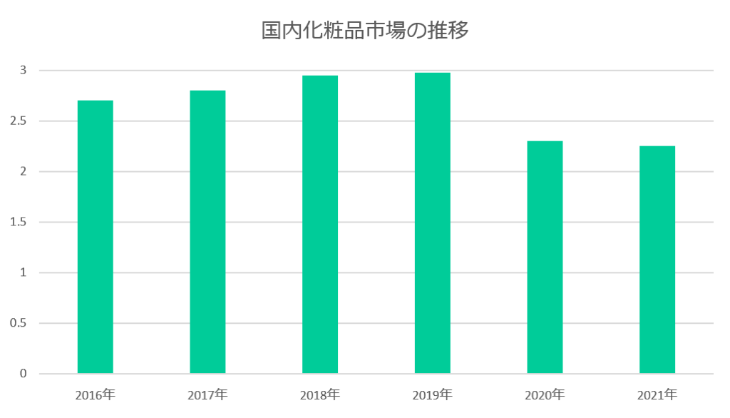 化粧品業界は海外展開、性別を超えた製品の開発等も行われて市場は2012年から右肩上がりで推移していました。インバウンド需要に大きな恩恵を受けていた事もありコロナ禍の2020年には化粧品出荷額は約3000億円減少しています。
