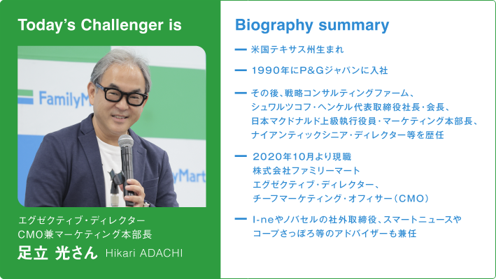 ファミリーマートは「チャレンジする方のコンビニ!」であり続ける。足立さんの言葉からは、そんな思いが伝わってきました。その思いは純粋で貪欲。心から楽しんでいないと出ない言葉だなと深く感銘を受けました。