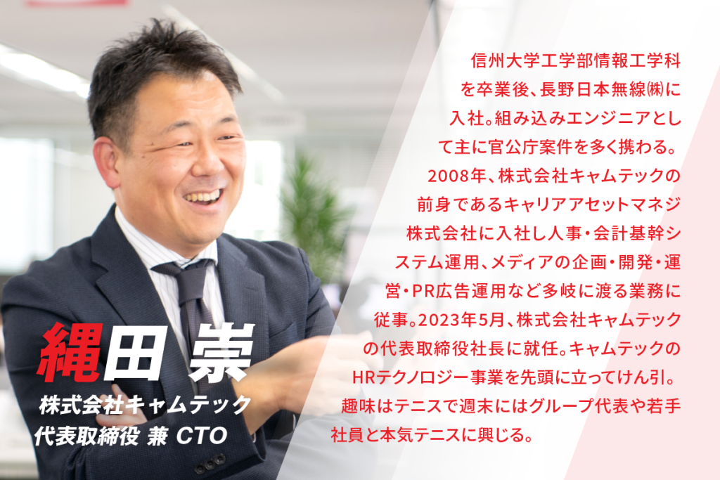 さまざまなHRテクノロジーの開発を行うほか、海外人材ソリューションなど、その事業領域は多岐にわたる株式会社キャムテック。新しい代表取締役に2023年5月10日付で就任した、現役エンジニアでもある縄田 崇さんに根掘り葉掘り聞いてみました!
